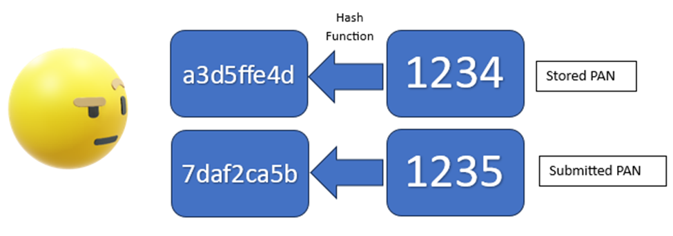 The PAN is secured by the key without additional cryptography, requiring only secure key management. A keyed cryptographic hash prevents secret exposure while validating its value, even for small secrets like a PAN. Its strength lies in irreversibility, with the key preventing brute force attacks on small secrets.